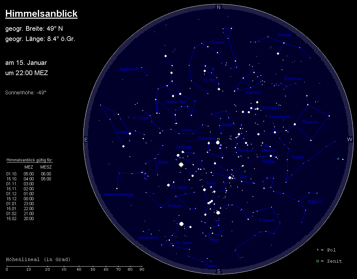 Im Südwesten finden wir das Sternbild Walfisch bereits im Untergang. Das Himmelsareal östlich des Walfischs nimmt das ausgedehnte Sternbild Eridanus ein, welches nahe Rigel beginnt und dann zunächst nach Westen, im weiteren Verlauf nach Süden strebt, wobei sein Fußpunkt mit dem hellen Stern Achernar bei uns nie aufgeht.