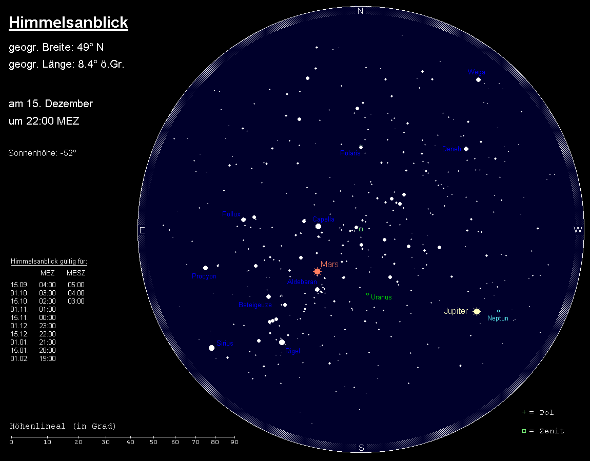 stand Anfang November in Opposition zur Sonne und kann im Dezember optimal beobachtet werden. Die Helligkeit des grünlichen Planeten sinkt leicht von 5.6m auf 5.7m ab. Er bewegt sich rückläufig durch den südöstlichen Teil des Sternbilds Widder, leider weitab markanter Sterne. Dennoch kann man versuchen, den sechsten Großplaneten unter dunklem Himmel auch mit dem bloßen Auge zu entdecken, wobei die relative Sternarmut sogar von Vorteil ist. Am frühen Abend des 5. Dezember ereignet sich die zweite von Karlsruhe aus beobachtbare Uranusbedeckung durch den Mond in diesem Jahr. Der Eintritt erfolgt um 17:36 MEZ (Höhe: 24°, nautische Dämmerung), der Austritt um 18:25 MEZ (Höhe: 32°). Im Teleskop zeigt sich das grünliche Uranusscheibchen ab etwa 100-facher Vergrößerung 3.7“ groß. Besitzer mittelgroßer Instrumente können sich auch an den größten Uranusmonden Titania (13.8m) und Oberon (14.1m) versuchen, die sich nie weiter als etwa 30“ bzw. 40“ vom Uranusscheibchen entfernen.