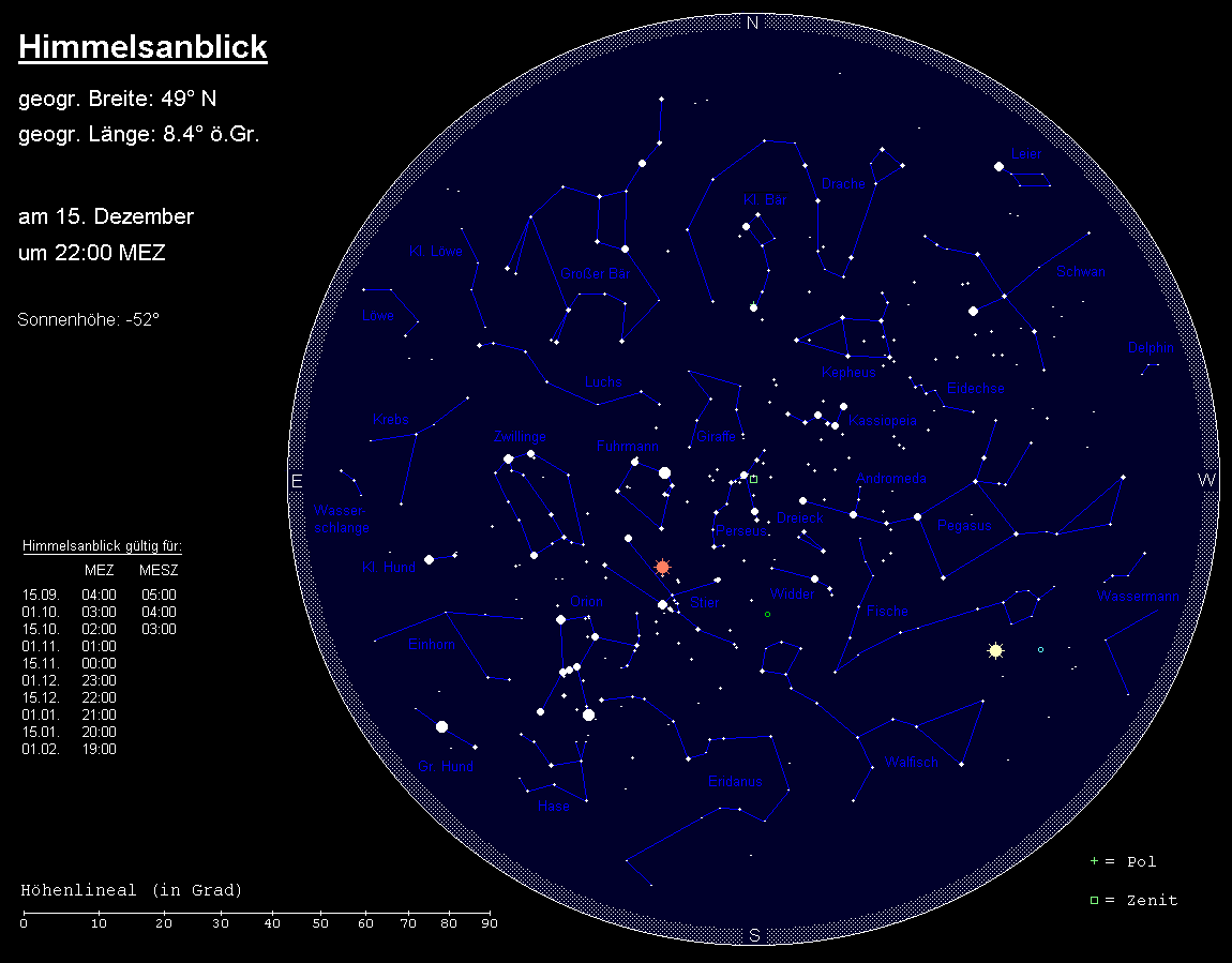 Im Südwesten geht das Sternbild Wassermann unter. Ein Großteil des Südwesthimmels nimmt das Sternbild Walfisch ein, welches nicht einfach auszumachen ist. Im Süden kulminiert das noch schwieriger zu identifizierende ausgedehnte Sternbild Eridanus, das sich von Rigel im Orion in einem weiten Bogen zunächst nach Westen und dann nach Süden zieht und dessen hellster Stern Achernar von uns aus gesehen nie über den Horizont steigt. Über unseren Köpfen – genau im Zenit – steht das Sternbild Perseus und östlich davon das Sternbild Fuhrmann mit der hellen Capella. Südlich dieser beiden Sternbilder erstreckt sich der Stier mit dem orangefarbenen Aldebaran und den zwei Sternhaufen Hyaden (um Aldebaran) und Plejaden (rechts oberhalb von Aldebaran). Dieses Jahr steht zudem der helle Mars im Sternbild Stier.