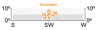 taucht in der ersten Dezemberdekade über dem südwestlichen Abendhorizont auf. Der –3.9m helle Abendstern kann am besten gegen 16:45 MEZ gesucht werden. Bis zum Jahresende kann Venus ihre Sichtbarkeit nur geringfügig verbessern. Am 24. Dezember steht die schmale Mondsichel 4.5° links unterhalb der Venus. Am 29. Dezember passiert Merkur den Abendstern in 1.5° nördlichem Abstand, der sie während der gesamten zweiten Dezemberhälfte begleitet.