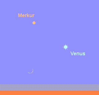 bietet in der zweiten Dezemberhälfte eine sehr bescheidene Abendsichtbarkeit. Erstmals kann er um den 15. Dezember sehr tief über dem südwestlichen Abendhorizont ausgemacht werden. Den –0.6m hellen Planeten sollte man gegen 16:45 MEZ aufsuchen. Bis zu den Weihnachtstagen, an denen die größten, aber immer noch sehr bescheidenen Horizonthöhen erreicht werden, bleibt die Helligkeit konstant. Danach nimmt sie von Tag zu Tag merklich ab, so dass Merkur selbst von Spezialisten wohl in den letzten Dezembertagen unsichtbar wird. Für die Identifikation von Merkur sehr hilfreich ist die Tatsache, dass sich die deutlich hellere Venus die gesamte Merkursichtbarkeit hinweg nie mehr als 6° entfernt aufhält. Die größte östliche Elongation von 20° wird am 21. Dezember erreicht. Am 24. Dezember findet man die schmale Mondsichel 5.5° unterhalb von Merkur. Am 29. Dezember, an dem er rückläufig wird, passiert Merkur die wesentlich hellere Venus in 1.5° nördlichem Abstand.