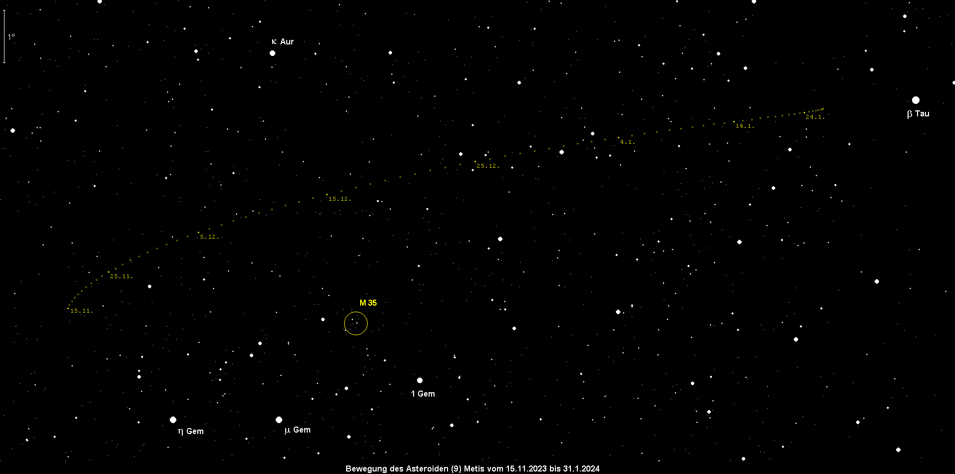 kommt am 22. Dezember im östlichen Teil des Sternbilds Stier in eine sehr günstige Opposition und erreicht dabei eine Maximalhelligkeit von 8.4m. Am 1. Dezember ist Metis erst 8.9m hell und am 31.12. nur noch 8.6m. Damit bleibt Kleinplanet Nr. 9 aber den gesamten Monat über ein relativ leichtes Fernglasobjekt. Da sie sich noch ein paar Grad nördlicher als Vesta bewegt kann sie wie Vesta über viele Stunden hinweg gut beobachtet werden.