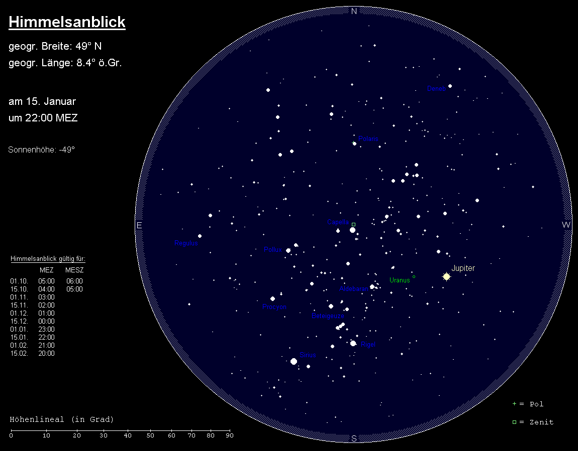 wird am 27. Januar stationär und bewegt sich anschließend wieder rechtläufig durch das Sternbild Widder, wobei er etwa 13° östlich Jupiters steht. Der 5.7m helle Planet verlagert seine Untergänge von 4:00 MEZ auf 2:00 MEZ, doch wird er etwa eine Stunde zuvor unsichtbar. Die Meridianpassage (beste Beobachtungszeit) verschiebt sich von 20:45 MEZ auf 18:45 MEZ. Den Mond findet man am Abend des 19. Januars 2° oberhalb des grünlichen Planeten. Im Teleskop zeigt sich das 3.7“ große Uranusscheibchen ab etwa 100-facher Vergrößerung deutlich. Besitzer mittelgroßer Instrumente können sich auch an den größten Uranusmonden Titania (13.8m) und Oberon (14.1m) versuchen, die sich nie weiter als etwa 30“ bzw. 40“ vom Planetenscheibchen entfernen.
