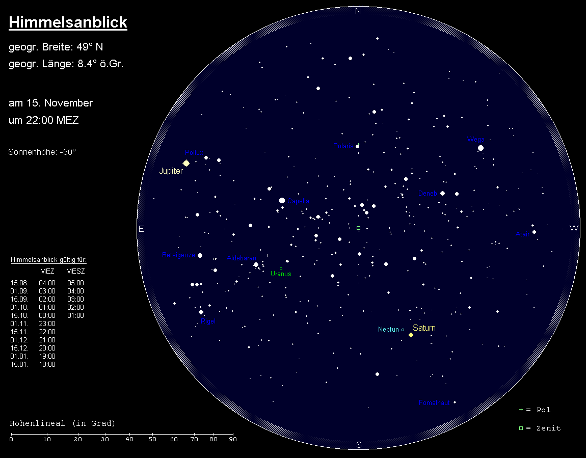 ist das dominierende Objekt fast der ganzen Nacht. Er wird am 11. November stationär und bewegt sich anschließend rückläufig durch das Sternbild Zwillinge, nahe des Sterns Pollux. Seine Helligkeit steigt von –2.3m auf –2.5m an. Der Aufgang verlagert sich im Monatsverlauf von 21:30 MEZ auf 19:30 MEZ. Am Morgen des 10. November findet man den Mond 4° rechts oberhalb des Gasplaneten. Im Teleskop können auf dem elliptischen Planetenscheibchen, dessen Äquatordurchmesser von 40.6“ auf 44.2“ anwächst, vielfältige atmosphärische Strukturen ausgemacht werden. Hierzu zählen neben dem auffälligen nördlichen und südlichen Äquatorband und dem Großen Roten Fleck einige weitere Bänder, die sich näher an den Polen befinden, aber deutlich unauffälliger sind. Zudem ist das täglich wechselnde Spiel der vier hellsten Monde reizvoll zu verfolgen, genauso wie die Erscheinungen der Monde (Bedeckungen bzw. Verfinsterungen durch Jupiter und Vorübergänge bzw. Schattenwürfe vor der Jupiterscheibe). Mit größeren Instrumenten und hohen Vergrößerungen können die vier hellsten Monde sogar als winzige Scheibchen erkannt werden, mit Durchmessern von 1.1“ bis 1.8“. Spezialisten können sich zudem am Mond Himalia versuchen. Dieser ist zwar im November nur 15.0m hell, befindet sich aber Ende November mehr als 50‘ westlich des hellen Planeten.