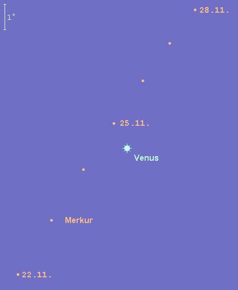 stand Ende Oktober in größter östlicher Elongation, konnte aber nicht am Abendhimmel beobachtet werden. Er wird am 10. November rückläufig und steht am 20. November in unter Konjunktion mit der Sonne. In den folgenden Tagen entfernt er sich rasch von unserem Zentralgestirn und kann von Spezialisten bereits ab dem 25. November tief über dem südöstlichen Morgenhorizont aufgefunden werden. Zwar ist er an diesem Tag lediglich 2.1m hell, so dass er in der hellen Dämmerung selbst im Fernglas ein schwieriges Objekt sein dürfte, doch steht er nur 1.1° links oberhalb der Venus. Die beiden Planeten können ab 7:15 MEZ tief über dem südöstlichen Morgenhorizont gesichtet werden. Am 29. November wird der bereits 0.4m helle Merkur stationär und bewegt sich anschließend wieder rechtläufig durch das Sternbild Waage. Am letzten Novembermorgen sollte der 0.0m helle Planet gegen 7:00 MEZ ein bereits für das bloße Auge einfaches Objekt sein.