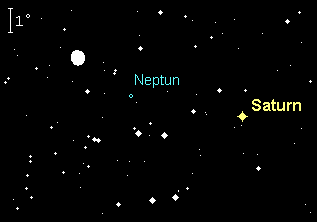 kann etwa bis Mitternacht im westlichen Teil des Sternbilds Fische, etwa 4° rechts oberhalb von Saturn und nahe der im Fernglas gut erkennbaren Sterne 27, 29, 30 und 33 Psc beobachtet werden. Die rückläufige Bewegung des 7.8m hellen Planeten wird dabei stetig langsamer. Sein Untergang verlagert sich im Monatsverlauf von 3:45 MEZ auf 1:45 MEZ. Zwei Stunden zuvor verschlucken ihn die horizontnahen Dunstschichten. Den Mond findet man am frühen Abend des 2. November 2.5° links oberhalb des fernsten Großplaneten, und am späten Abend des 29. November 2.5° rechts von diesem. Da der Mond allerdings bereits sehr hell ist, dürfte eine Sichtung schwierig sein. Im Teleskop zeigt Neptun ein 2.3“ großes Scheibchen, das etwa ab 200x erkannt werden kann. Zudem kann mit größeren Instrumenten sein größter Mond Triton (13.4m) in maximal 16“ Distanz vom Planetenscheibchen ausgemacht werden.