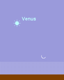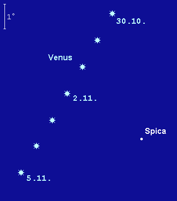 wird ab der zweiten Monatshälfte ein mit dem bloßen Auge schwierigeres Objekt am Morgenhimmel. Der –3.9m helle Planet geht zu Monatsbeginn um 5:45 MEZ auf, am Monatsende erst um 7:15 MEZ. Sie wandert zunächst noch durch das Sternbild Jungfrau, wobei sie am 2. November den Hauptstern Spica 4° nördlich passiert. Am 13. November tritt sie ins Sternbild Waage. Am 19. November findet man die Mondsichel 6° rechts unterhalb der unauffälligen Venus. Am 25. November passiert der flinke Merkur die Venus in 1.1° nördlichem Abstand (siehe oben). Diese Konjunktion kann von Spezialisten mit einem Fernglas möglicherweise ausgemacht werden. Sinnvolle teleskopische Beobachtungen können nicht mehr durchgeführt werden.