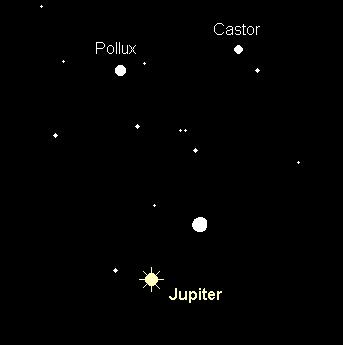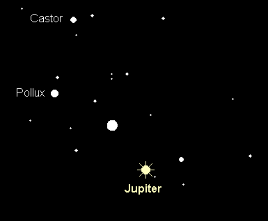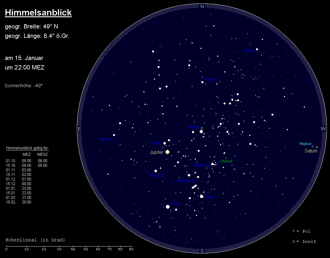 erreicht am 10. Januar seine Oppositionsstellung. Der rückläufig durch den östlichen Teil des Sternbilds Zwillinge wandernde Planet erreicht in jenen Tagen seine maximale Helligkeit von –2.7m und ist damit ein unübersehbares Objekt des Nachthimmels. Er geht bei Sonnenuntergang im Nordosten auf und bei Sonnenaufgang im Nordwesten unter. Seine größte Horizonthöhe von 64° erreicht er kurz nach Mitternacht. Der Mond passiert im Januar zweimal den größten Planeten unseres Sonnensystems. In der Nacht 3./4. Januar steht unser Erdtrabant gegen Mitternacht 3° links oberhalb von Jupiter, und am Morgen des 31. Januar gegen 5:00 MEZ 3° rechts oberhalb. Im Teleskop präsentiert der Planet ein ovales Scheibchen mit einem Äquatordurchmesser von 46.6“ und einem Poldurchmesser von 43.6“. Er zeigt eine hochdynamische Atmosphäre mit dem auffälligen Nördlichen und Südlichen Äquatorialband, wobei am Südrand des letzteren der auffällige Große Rote Fleck gefunden werden kann. Weitere Bänder können mit größeren Instrumenten festgestellt werden. Aufgrund der langen Januarnächte ist es möglich, die gesamte Atmosphäre in einer Nacht zu beobachten, da die Rotationszeit etwas weniger als 10 Stunden beträgt. Darüber hinaus bieten die vier hellsten Jupitermonde interessante Konstellationen, die von Nacht zu Nacht sehr unterschiedlich ausfallen. Zudem sind zahlreiche Bedeckungen und Verfinsterungen durch Jupiter bzw. seinen Schatten, sowie Durchgänge und Schattenvorübergänge der Monde vor der Jupiterscheibe zu beobachten. Spezialisten können sich an dem weiter außen umlaufenden Mond Himalia versuchen, der sich bis zu einem Grad von Jupiter entfernen kann, allerdings nur 14.9m hell ist. Anfang Januar findet man ihn etwa 40‘ westlich von Jupiter.