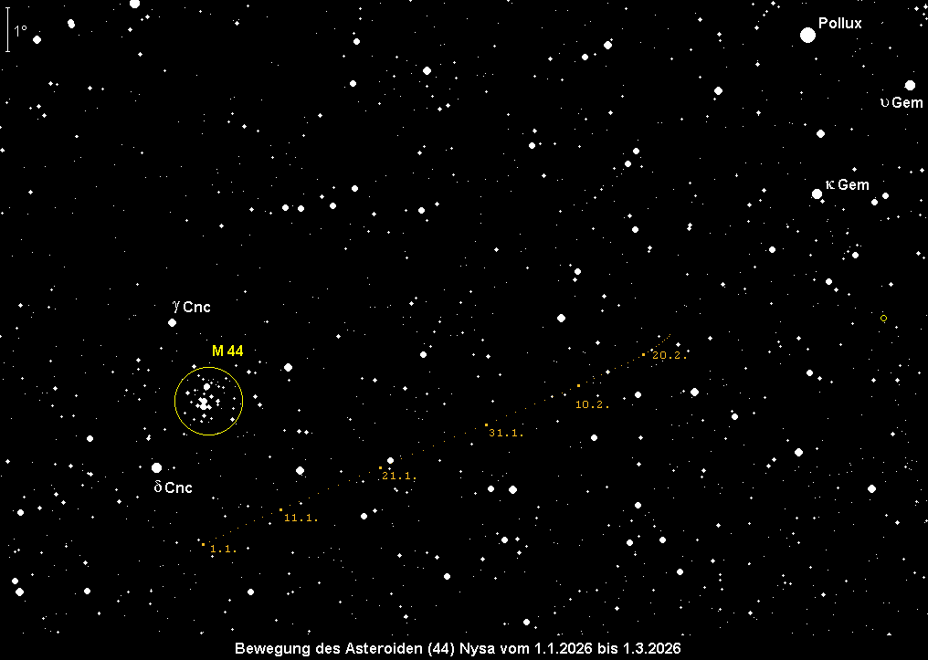 steht am 24. Januar in Opposition zur Sonne und wird dabei kurzfristig 8.8m hell. Anfang Januar ist sie erst 9.4m hell. Sie bewegt sich rückläufig durch das Sternbild Krebs und passiert um den 10. Januar den offenen Sternhaufen der Praesepe (M 44) in knapp 3° südlichem Abstand. Somit kann sie in großer Höhe beobachtet werden, am besten in der Nähe des Meridiandurchgangs. Diesen erreicht Kleinplanet Nr. 44 zu Monatsbeginn gegen 2:30 MEZ, am Monatsende bereits um 0:00 MEZ.